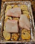 5. When the Potatoes are done cooking, remove them carefully and place on a potholder on the counter. Pat the Cod Fillets dry with a paper towel and then place the Cod Fillets on top of the Potatoes, skin side down.