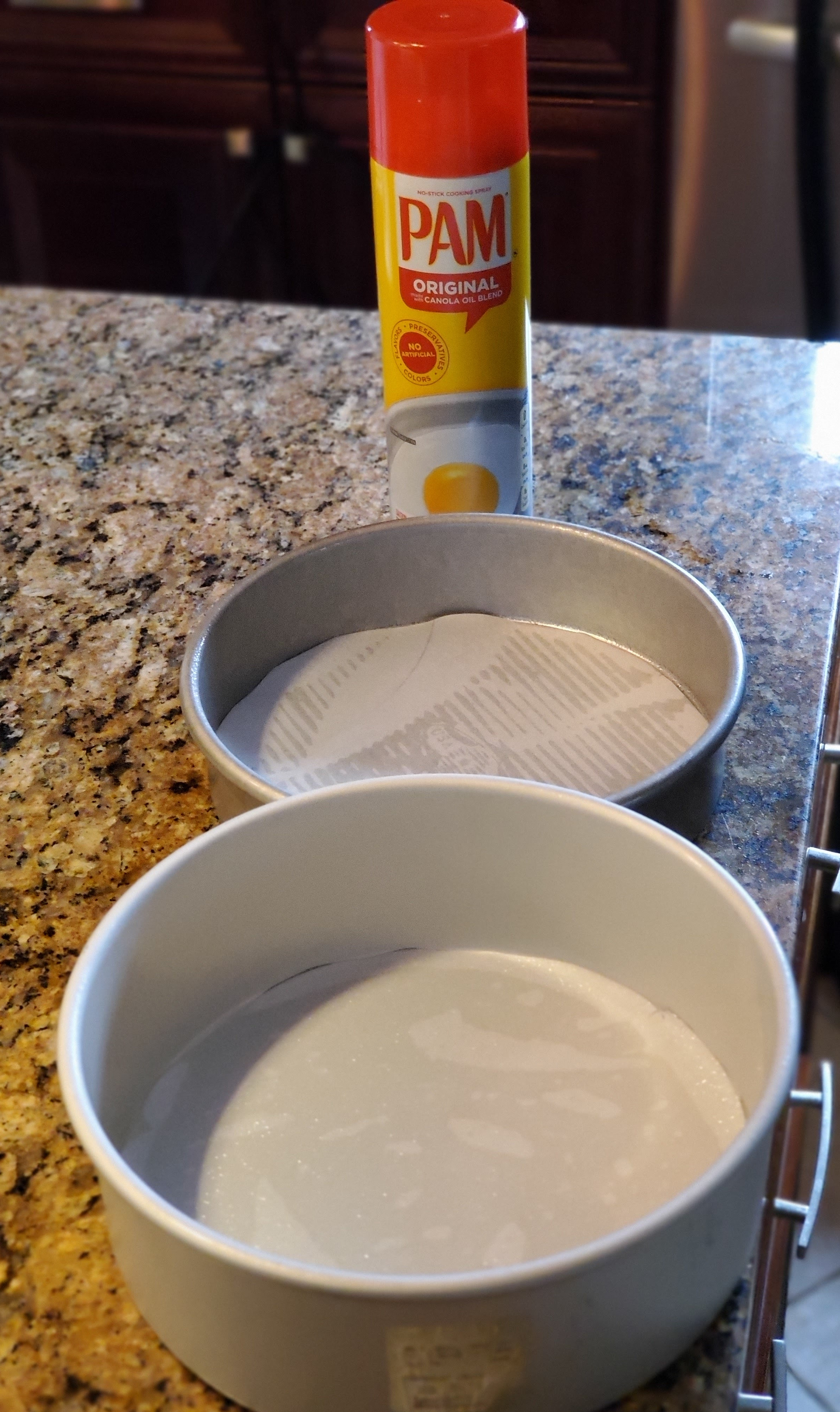 Spray 2 – 8 inch Cake Pans with Pam spray (You only need 1 cake for this recipe but the box mix makes 2. You can wrap the second cake in cling wrap and foil, and freeze.) Make sure to spray the sides as well. Add a parchment round to the bottom and spray with PAM again.