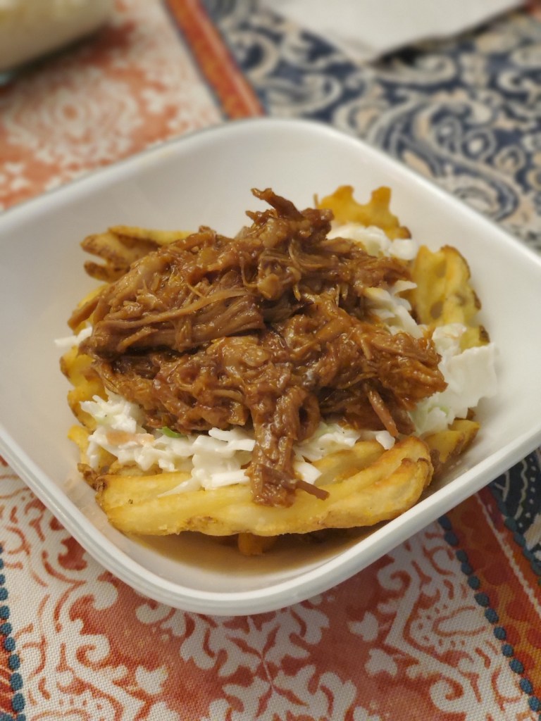 On our quest to keep eating at home interesting an fun, we are continuing with our Disney themed dinners and this one is as easy as it is delicious. If you have ever been to Walt Disney World, you know the Magic Kingdom is split into 6 distinct lands. One of my family’s favorites is Frontierland especially a small walk-up restaurant called The Golden Oak Outpost where they serve crispy waffle fries topped with BBQ Pulled Pork and cole slaw. It is pretty fantastic!