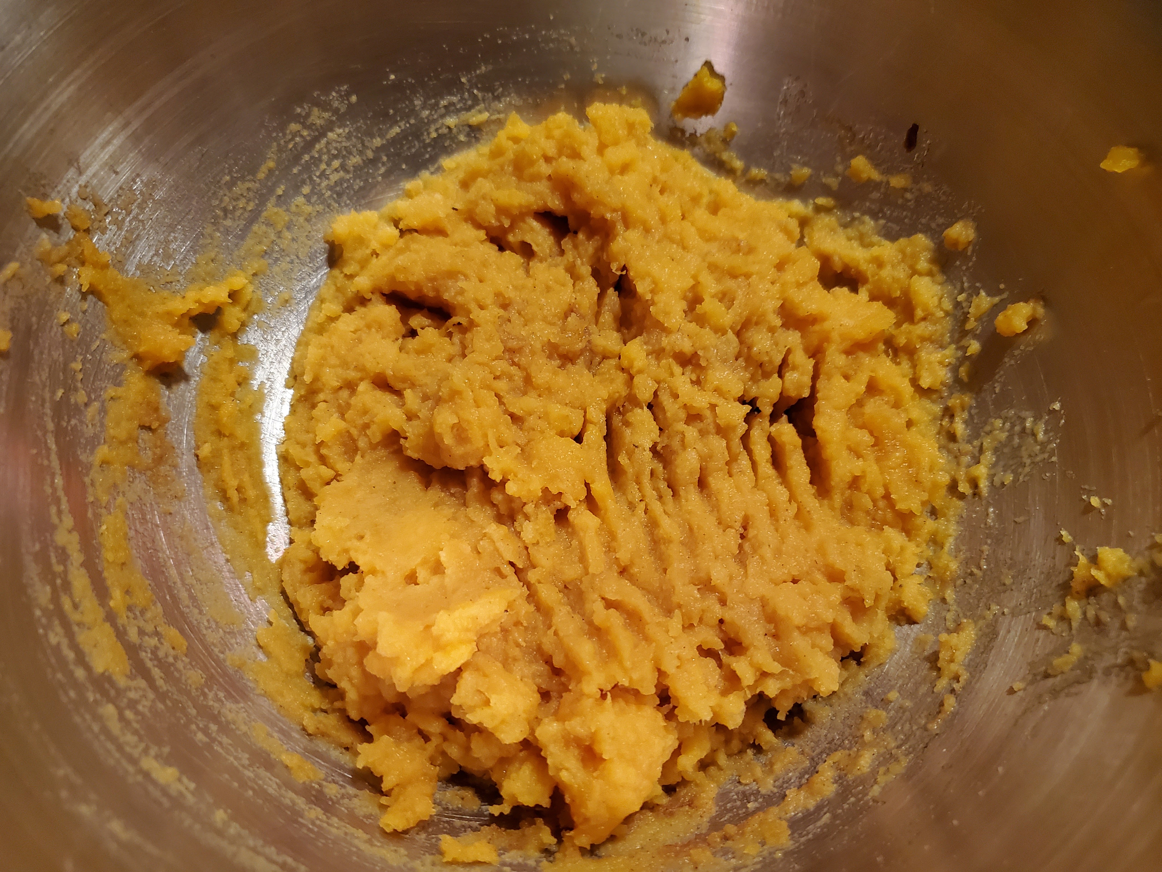-Add 1/2 Tbl Butter, 1/2 Tbl Milk, 2 Tbl Brown Sugar, 1/8 tsp Cinnamon, fresh ground Nutmeg, and a pinch of Salt, to the bowl with the Sweet Potato. Mix well.
