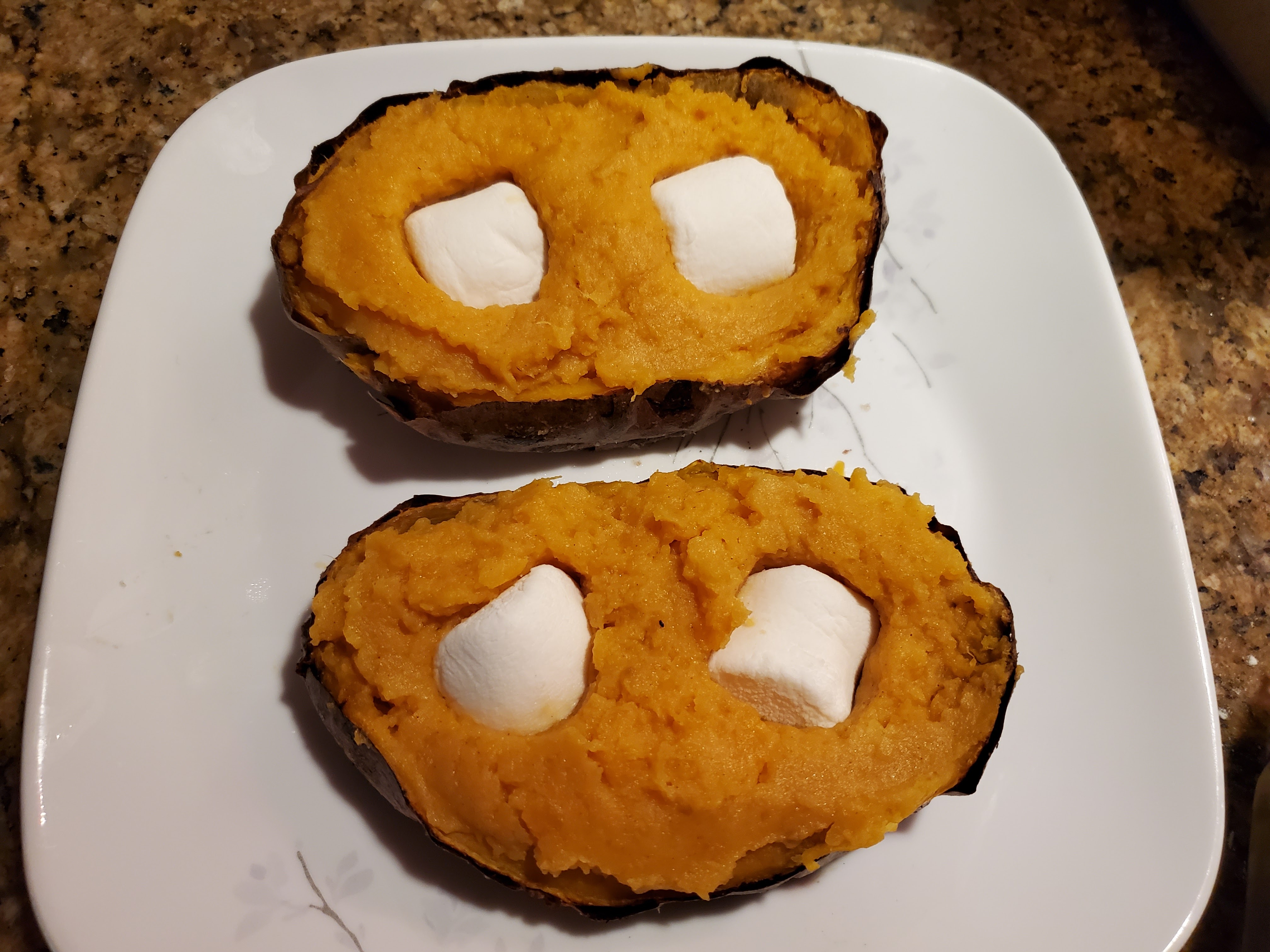 -Place 2 Marshmallow halves into the Sweet Potatoes.