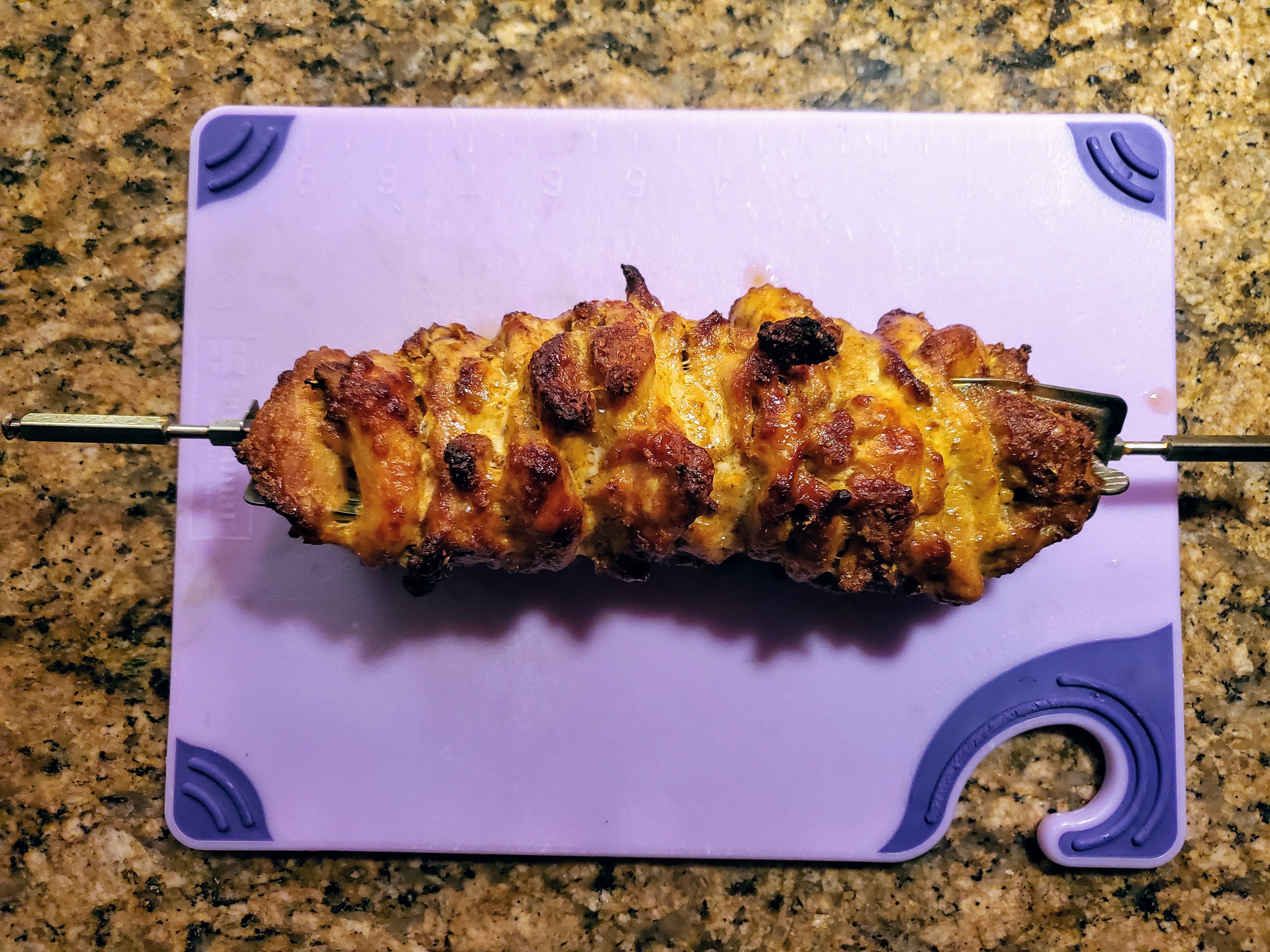 Thread the pieces of Chicken onto the spit, one piece at a time. Make sure the first piece is pushed down well onto the fork. Keep threading and stacking the Chicken and push the pieces together until you have all the Chicken threaded onto the spit. Place the second fork onto the spit and push down so it sandwiches the Chicken and holds it in place.