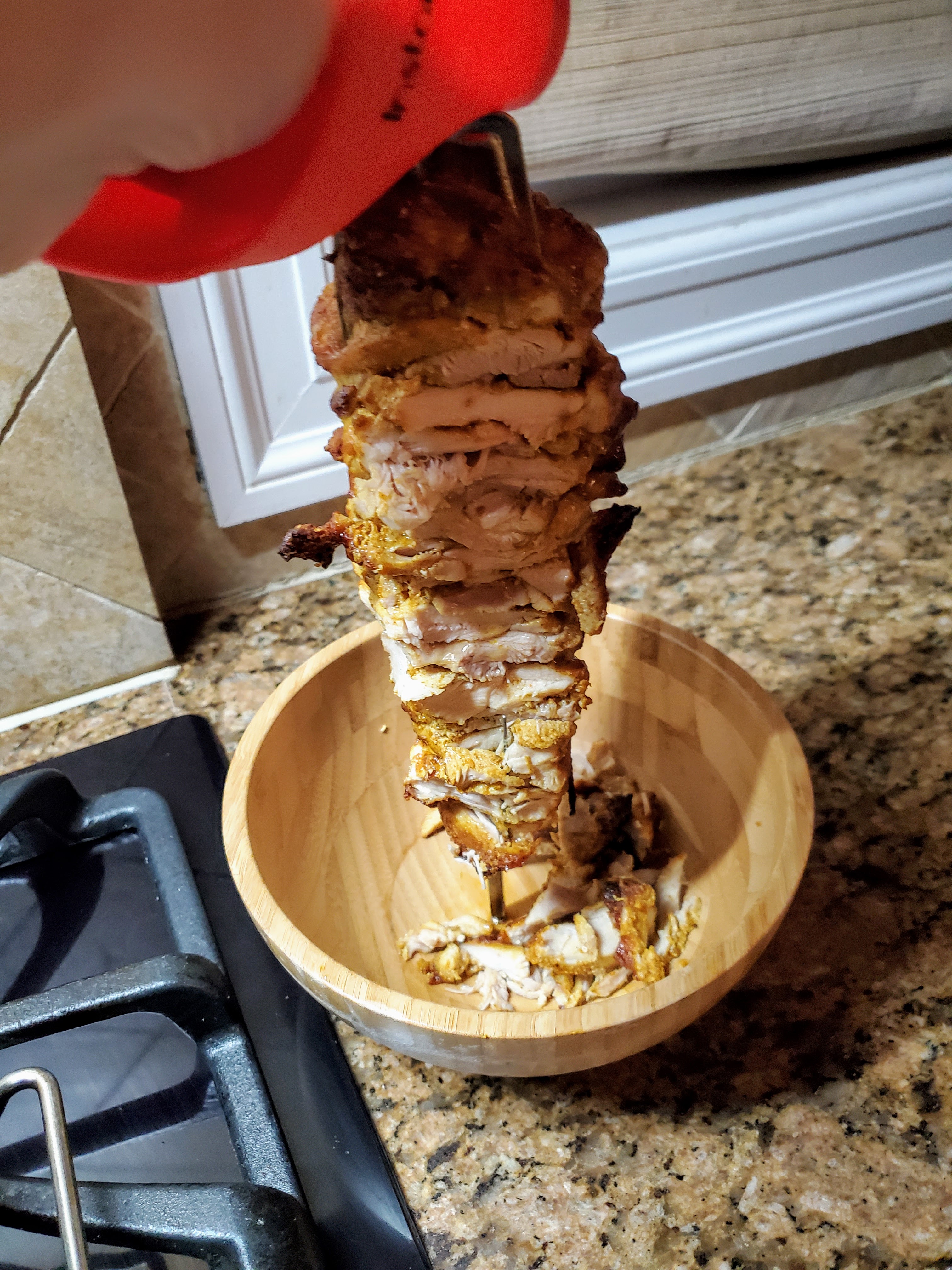 - The best way to carve this, is like it was a traditional Shawarma. Place one end in a large bowl, and hold the rotisserie vertically.