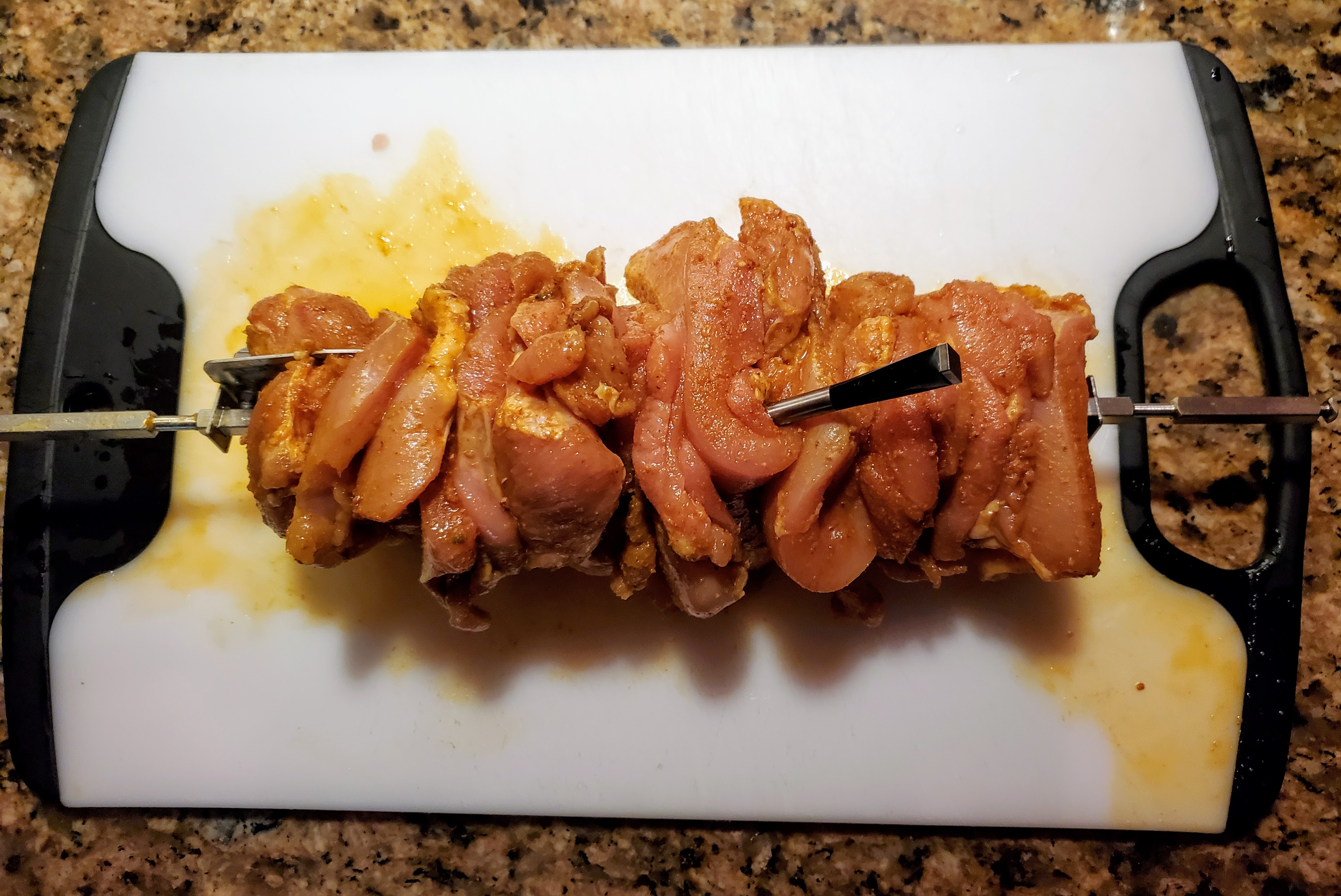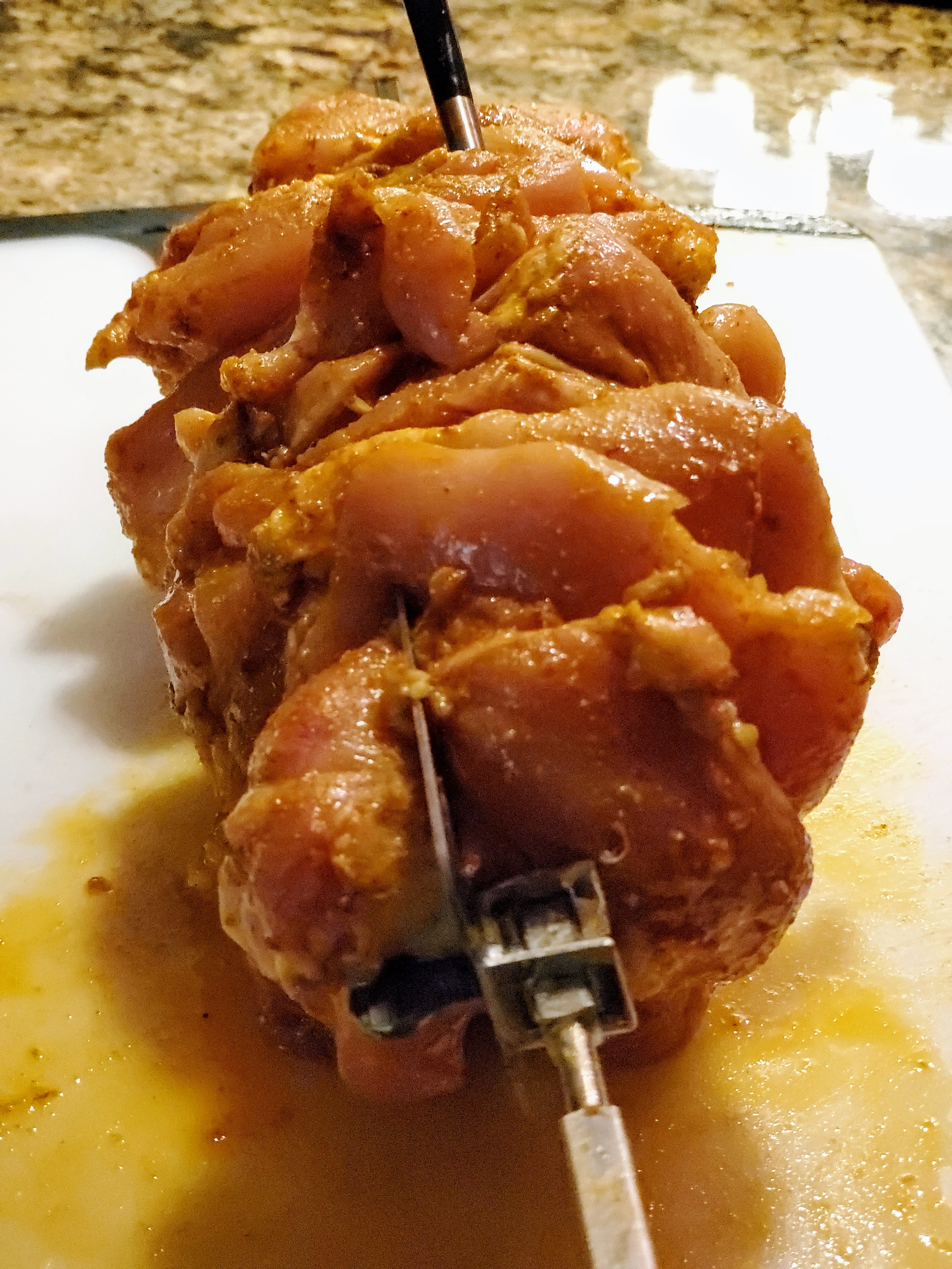 - Thread the pieces of Chicken onto the spit, one piece at a time. Make sure the first piece is pushed down well onto the fork. Keep threading and stacking the Chicken and push the pieces together until you have all the Chicken threaded onto the spit.