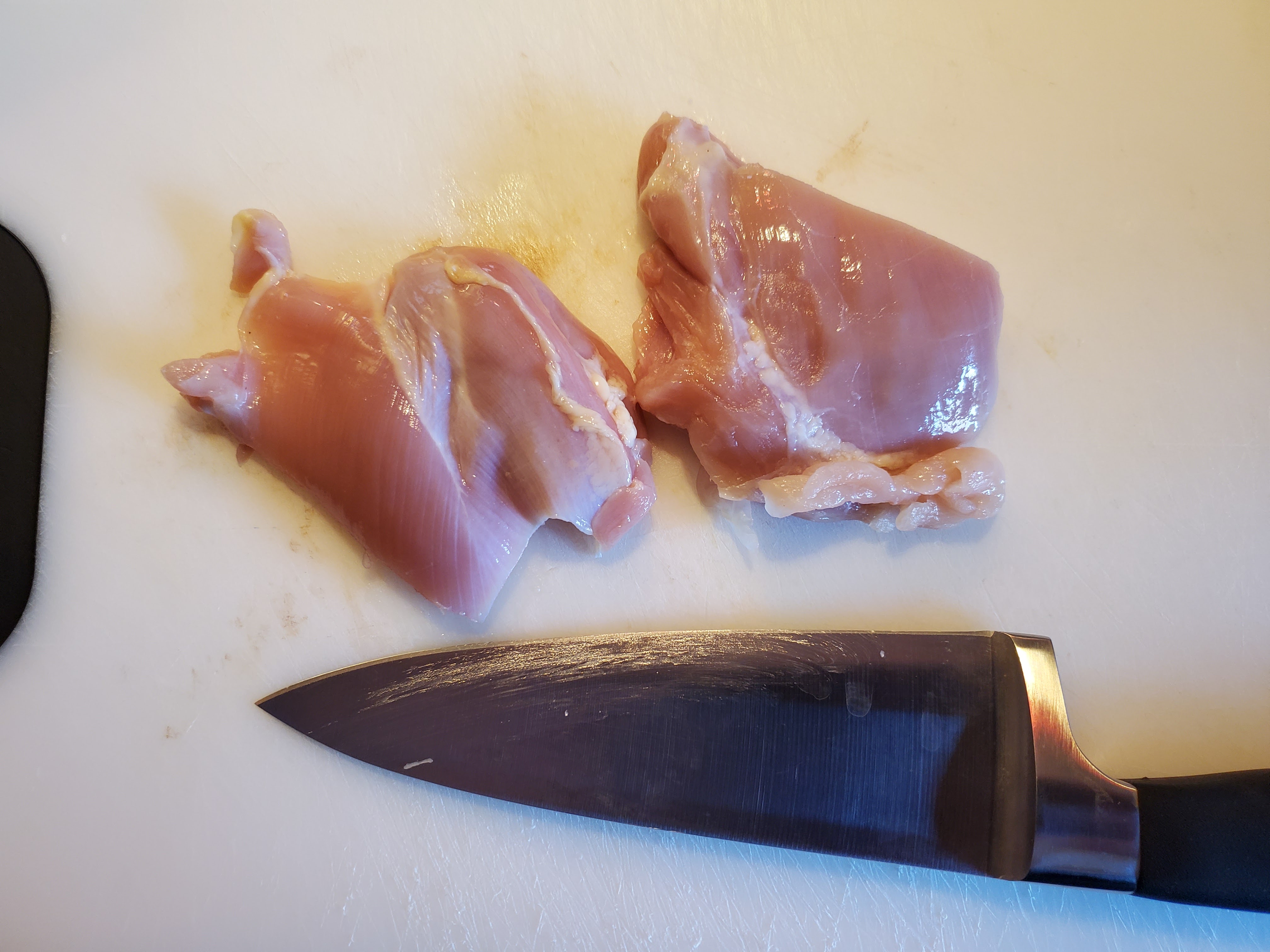 - Cut the Chicken Thighs in half so they are about 3 inches x 3 inches.